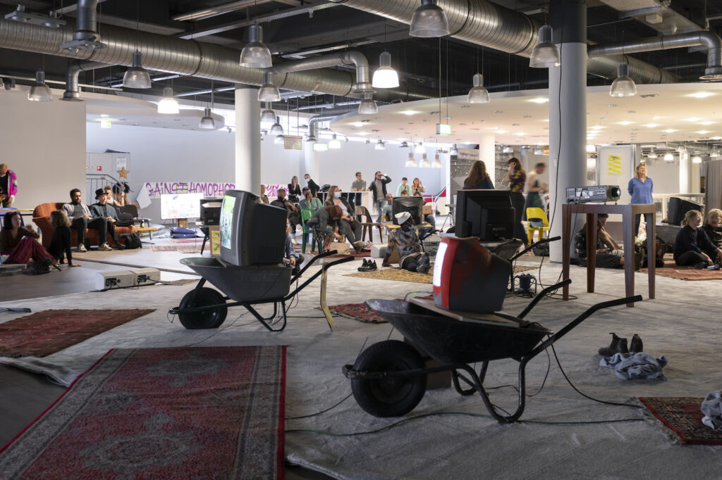 Ade Darmawan: In documenta, we approach lumbung not as a theme to be illustrated or discussed, but more as a way of working or mechanism. So we created mechanisms or protocols for how to practice ‘lumbung’ in exhibitions for example, or in communication and education. It really changed how we did curatorial research as well. We don’t go around looking for one particular artwork that can illustrate the lumbung practice, it’s not about that. It’s really about selecting also how artists work: ethics, politics, and how the ecosystem works – is it collective or not. So a lot of relations have been changed as well. For example we don’t do commissions, because commissioning logic is also coming from thematic logic, and the relationship between the artist and the commissioning institution makes the artist like a service provider. We changed that, and now it’s more about intention: we all agree on a certain value, so we set up a value that we work on, and then artists or collectives work and we respect what they have been doing, and what they are doing now and what will come after. So artists continue doing what they do, which is part of our approach towards documenta. We don’t want the work to be there just for documenta — instead we try to bring documenta to the larger ecosystem, so it’s also about that relationship.