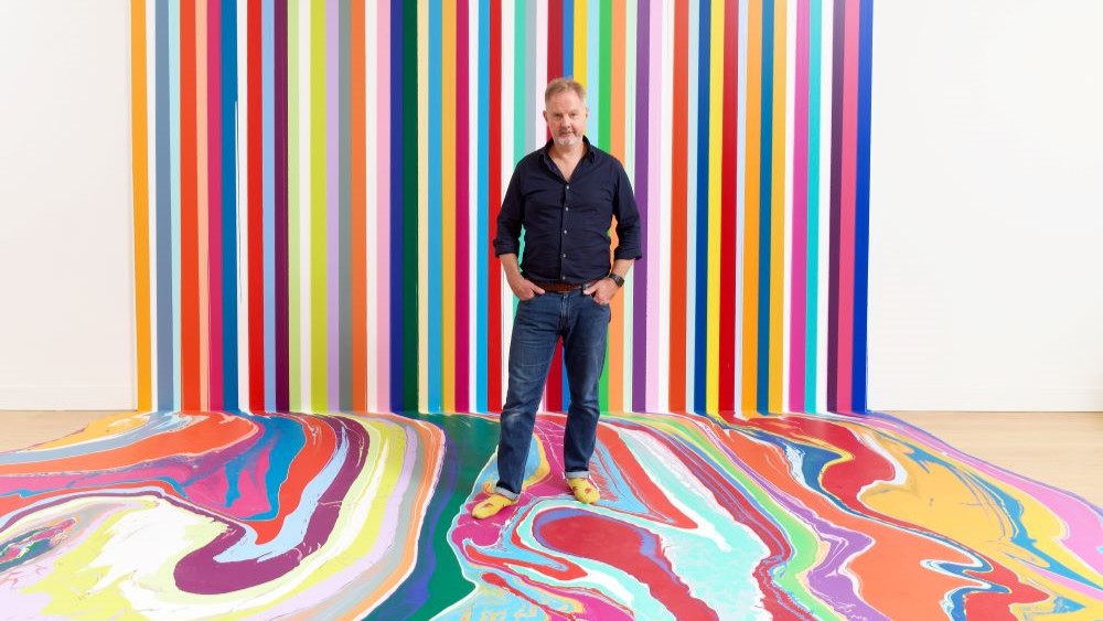 Ian Davenport brings his artistic philosophy to life, emphasizing that working on a large scale allows him to explore themes in painting that intrigue him. By manipulating paint on a grand scale, he transforms it into a sculptural entity, engaging in a captivating interplay with gravity and establishing a pronounced relationship between the artwork and the floor, akin to sculpture.