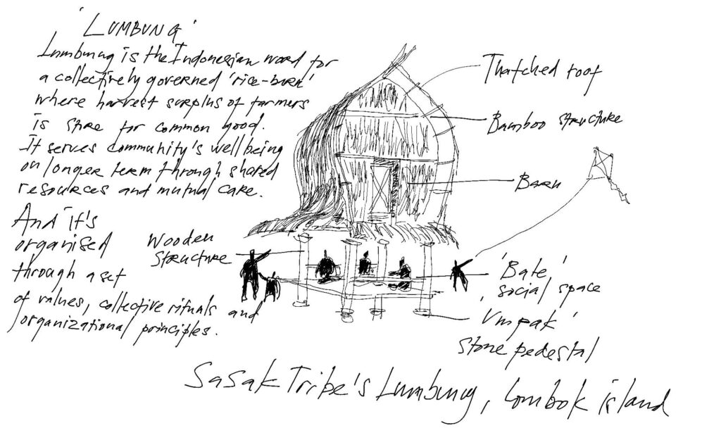 Iswanto Hartono: Architecturally as well, the word lumbung is a practice but it’s also a very particular and specific type of architecture. And its function as well, there is one type which is used as a lumbung, as a barn; and there is one which is a social space; and the third, is a domestic and a social space. This type of lumbung is spread out over the archipelago but is widely practiced in Southeast Asia and Asia as well. This is really embedded into our daily life, and the common share, anthropologically, and the way people live in Southeast Asia and Asia, is really attached to this structure. Different places like Bali, Toraja or Sunda have different structures as to where the lumbung is located and how people work with it, but it’s very central and a very important thing for society.
