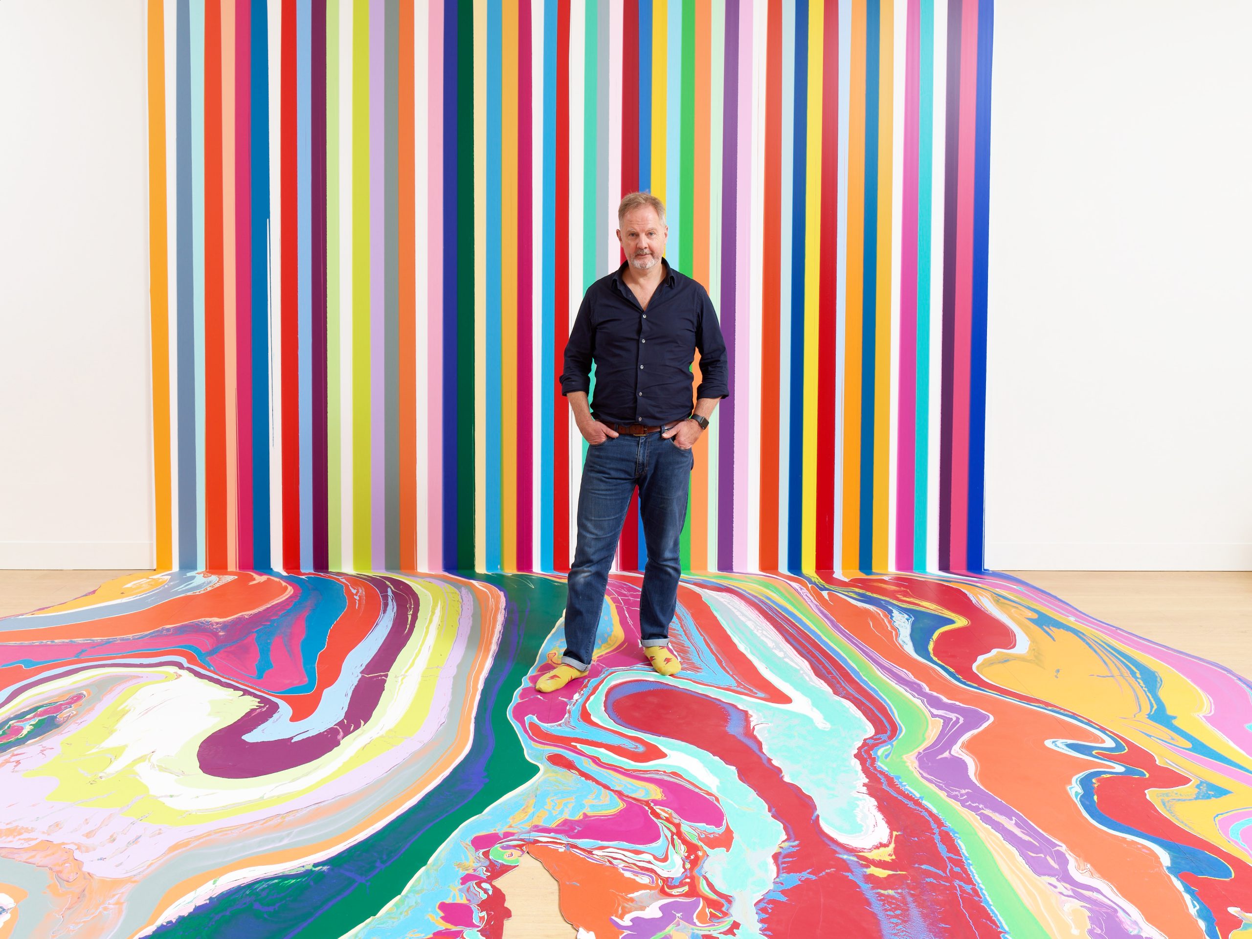 British abstract painter Ian Davenport will present Lake, a large-scale painting-installation that used 120 litres of paint in its creation, and an ambitious evolution of his “puddle” paintings. The genesis of this series of work at this scale started at the 57th Venice Biennale and has continued across various sites, most recently in 2022 at Rome’s historic cloister, Chiostro Del Bramante.