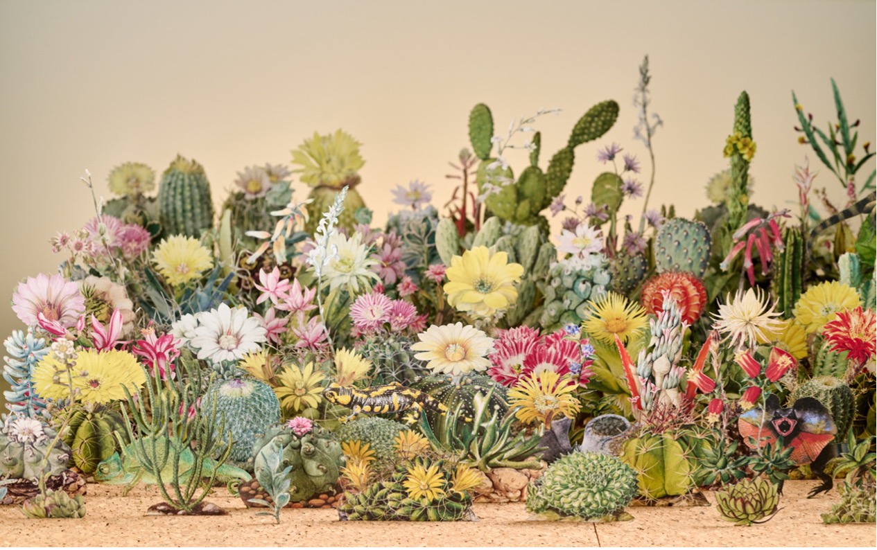 Explore Donna Ong’s fantastical ‘worlds’ in her series: Desert, Garden, Underground, Undergrowth, Underwater. Made from hand-cut paper shapes of flora and fauna and arranged into intricate miniature landscapes, each ‘world’ is housed in a glass vitrine similar to that of a terrarium. While a terrarium contains real plant specimens, their placement and the environment are entirely deliberate and controlled, bridging reality with the magical.